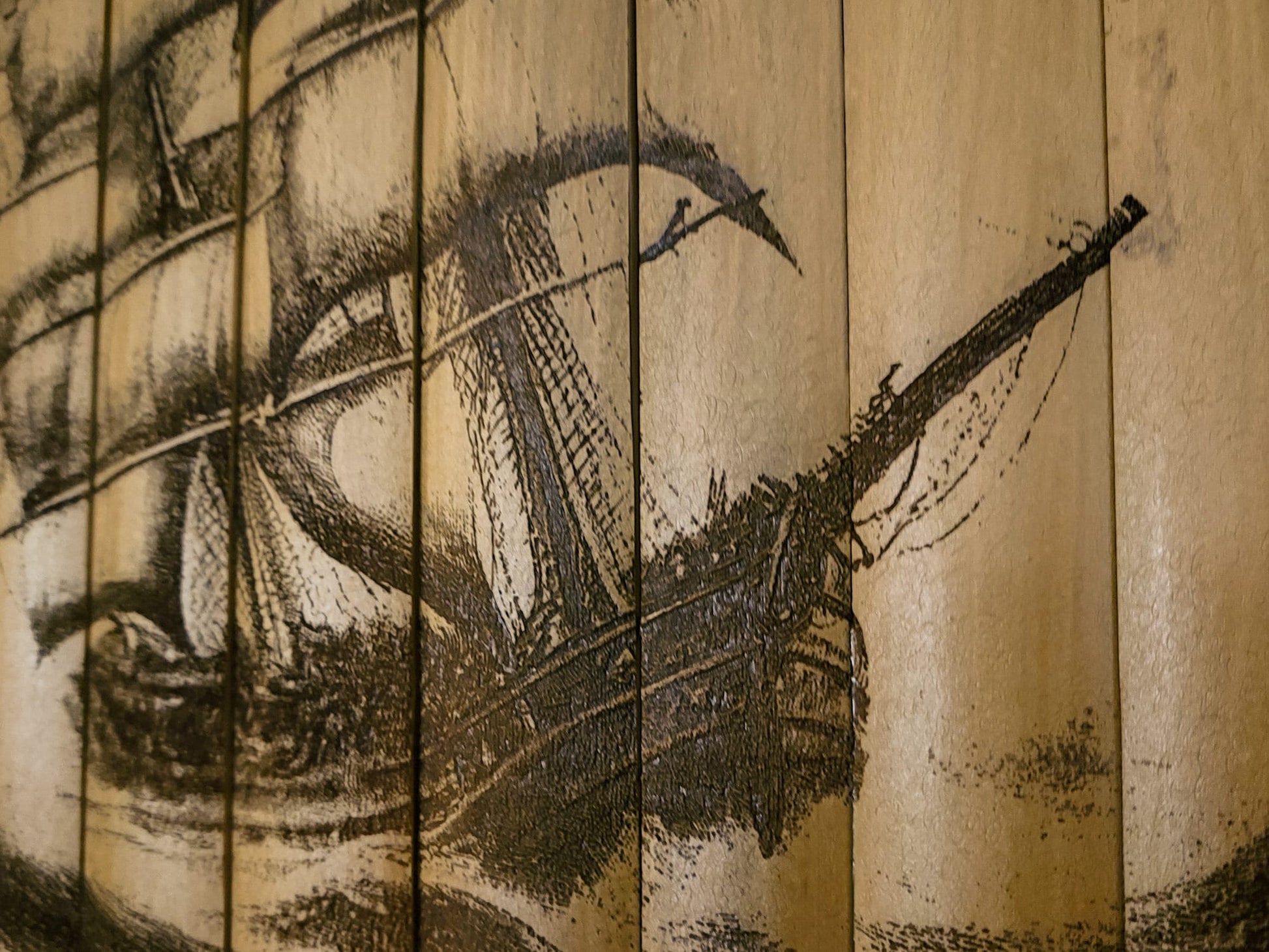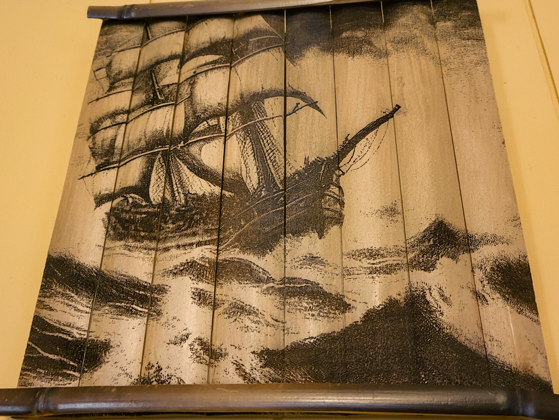 Real split bamboo wall hanging, with a laser etched wood carving of a full-rigged pirate sailing ship on rough Seas. Great for a tiki bar, tropical decor, mid-century modern or south pacific décor. It is coated in satin poly and has a string across the back for easy wall hanging.