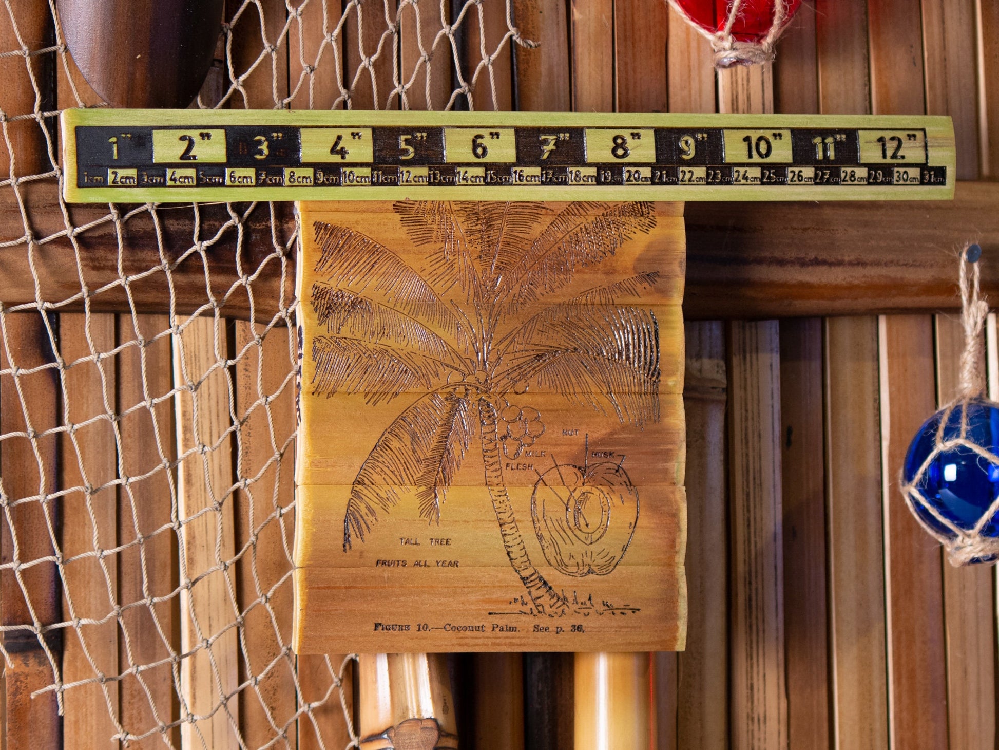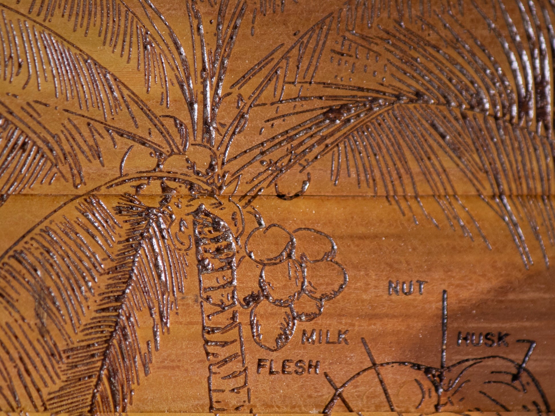 This wall hanging is a laser engraved public domain lithograph of a Coconut Palm from a 1944 Survival Guide.